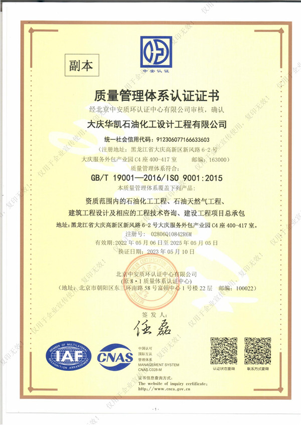 近日,我司順利通過質量管理體系認證,這標志著華凱公司在項目質量體系建設上已經達到了相關標準。質量管理體系認證證書的取得同時也是公司各項管理工作的規(guī)范化、標準化的體現(xiàn),是對公司持續(xù)穩(wěn)定健康發(fā)展的重要保證。我們將進一步優(yōu)化和規(guī)范各項管理制度,不斷提高體系運行的有效性,不斷提高公司的管理水平,共同推進公司的快速發(fā)展。自此,華凱公司質量管理體系的標準化、規(guī)范化及科學化又邁上新臺階。